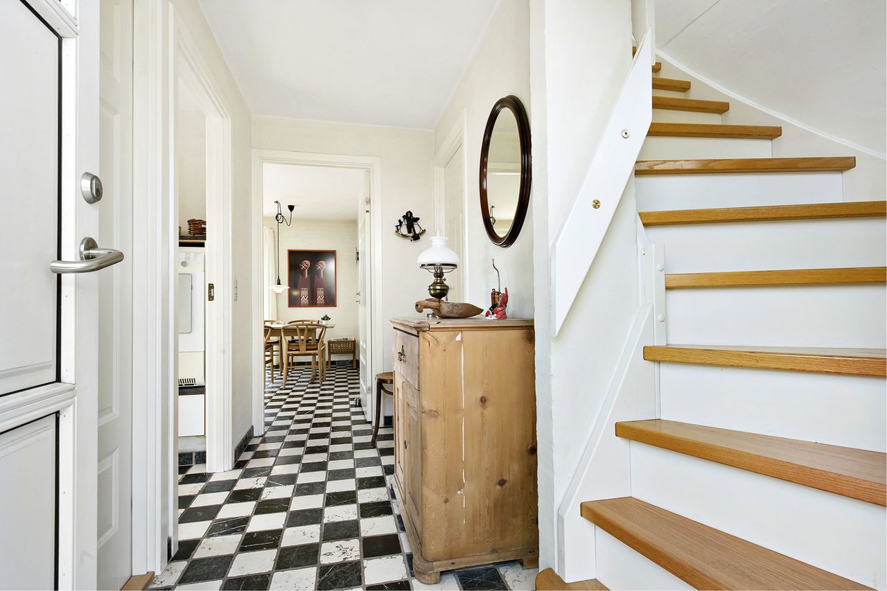 Ejendommen er funktionelt indrettet i lyst og venligt moderne design og byder dig indenfor via entreen, der fungerer som villaens fordelingsrum. Herfra har du adgang til lyst badeværelse, med stor bruseniche med fliser fra gulv til loft. Køkkenet er opsat i moderne stil med god bordplads, samt plads til spisebord. Fra køkkenet er der direkte udgang til terrassen. Via køkkenets franske døre kommer man ind til en stor opholdsstue med flot plankegulv og indemuret pejseindsats. Villaens 1. sal er indrettet med to ens værelse, og et stort master bedroom,derudover er der toilet på førstesalen.