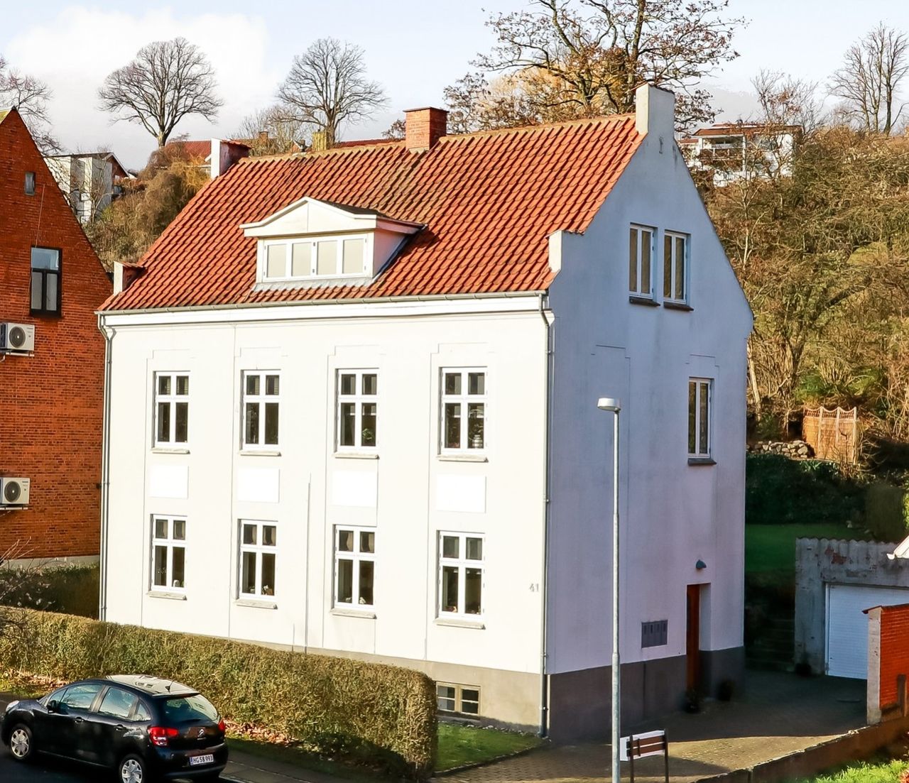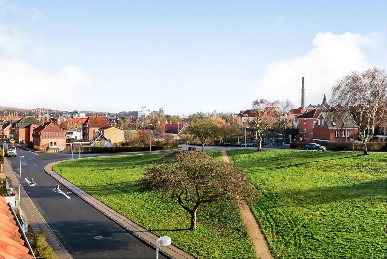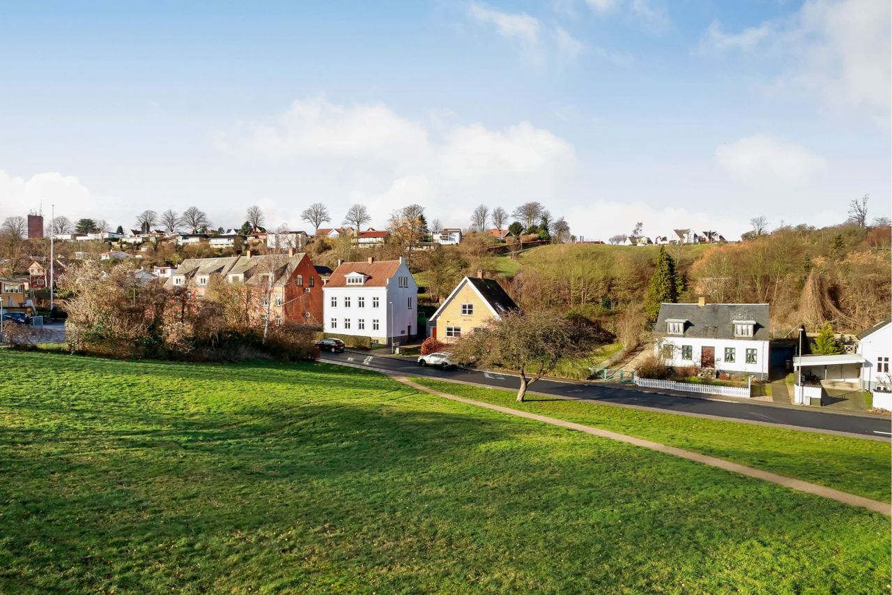 Det er i gå- og cykelafstand til alt og derudover får man en fantastisk udsigt ud over byen, Galgebakken, grønne områder og Svendborg Havn, hvilket er en udsigt, der ændrer sig i takt med, at vejr og årstider skifter.
