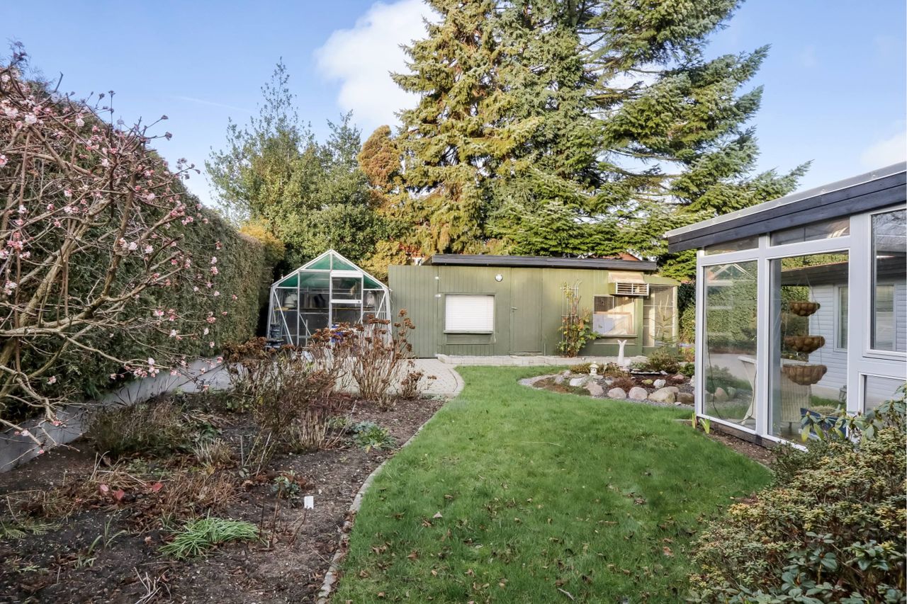 terrasseområder og dekorative bede samt et drivhus, hvor de grønne fingre kan få frit spil.
