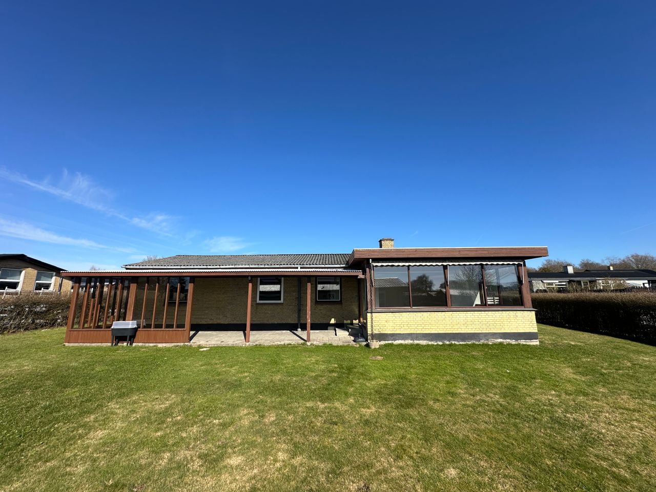 Udenfor får I glæde af en hyggelig, opvokset have med flot beplantning og en sydvestvendt, overdækket terrasse, der er både afskærmet og oplagt til lange sommeraftener. På grunden findes også en muret garage.